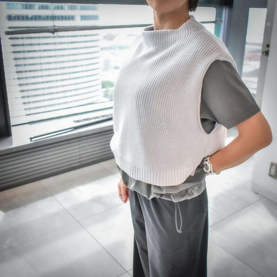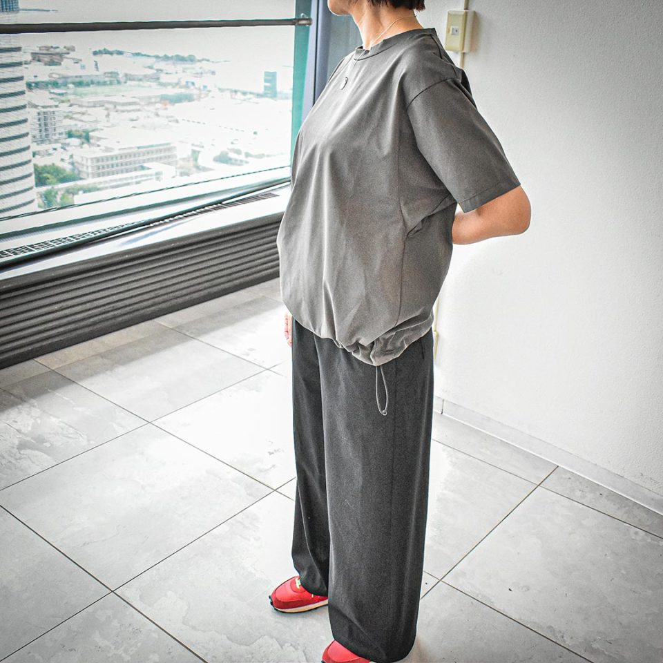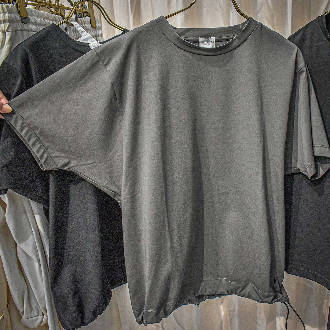 肩回りラグラン、袖テーパード、襟共生地により首、肩、袖がスッキリして見えます